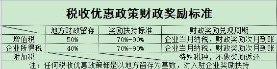 企业所得税:享受地方财政留存部分70%-90%的税收返还,企业所得税地方财政留存总额40%,增值税:享受地方留存部分70%-90%的税收返还,增值税税地方财政留存总额50%。